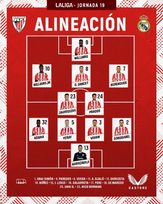 易边再战,第53分钟伊尼亚基·威廉斯传中造成库尔图瓦脱手,贝伦格尔抢射打破僵局。第67分钟,阿吉雷萨瓦拉扑出姆巴佩的点球。第78分钟贝林厄姆一度为皇马扳平,但2分钟后古鲁塞塔就进球再次取得领先。